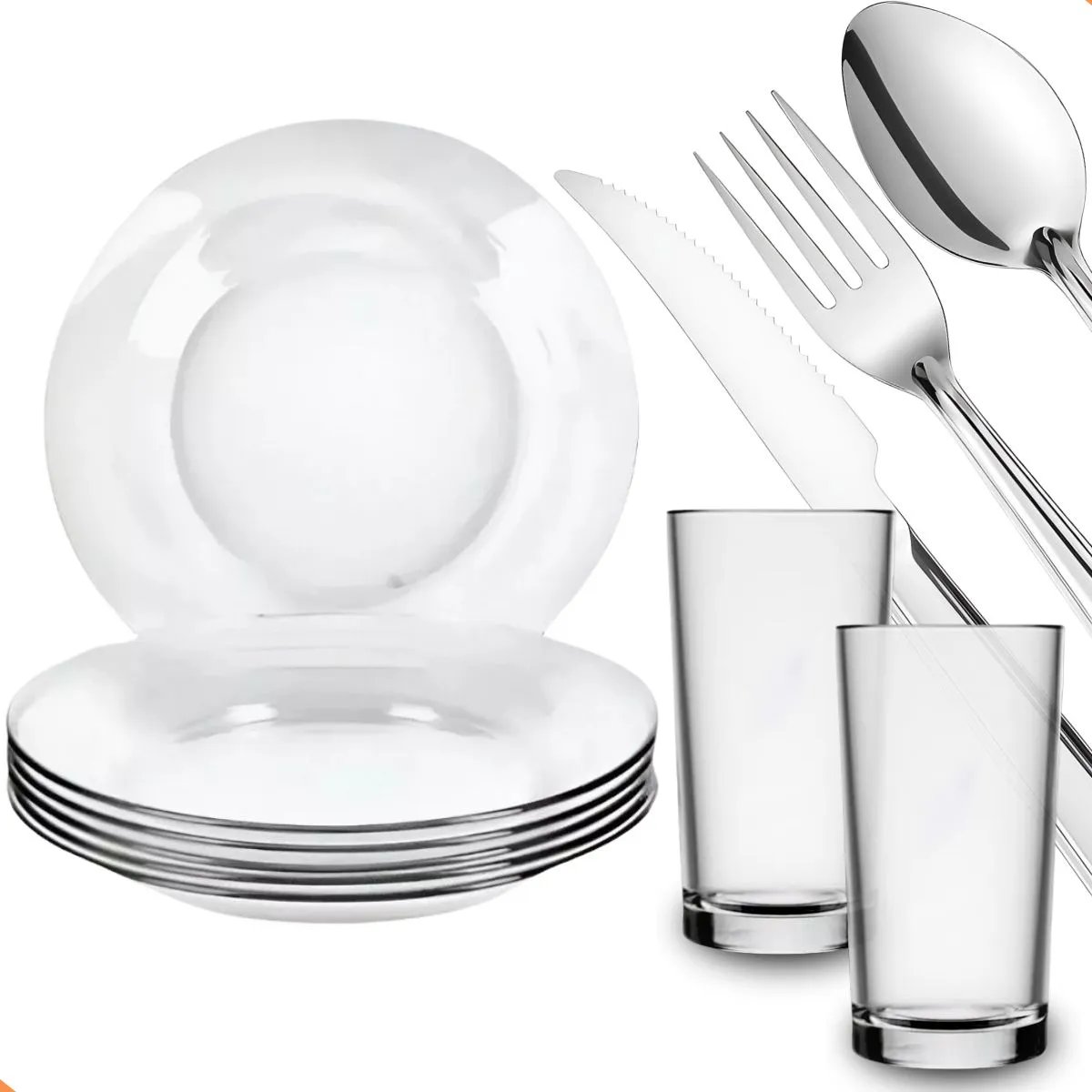 Aparelho De Jantar 30 Peças - Pratos + Copos + Talheres Inox
