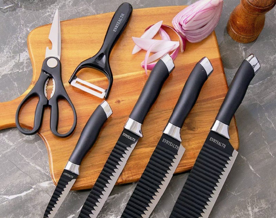 Confira Kit facas de cozinha/Churrasco Profissional Antiaderente 6 Peças Preto/colorido