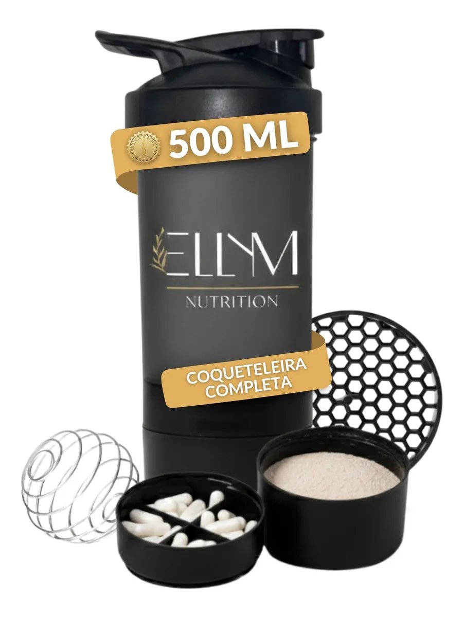 Coqueteleira Shakeira Garrafinha Ellym Nutrition Copo Academia Com Porta Comprimido e Whey 500ml Preta 15x8x8