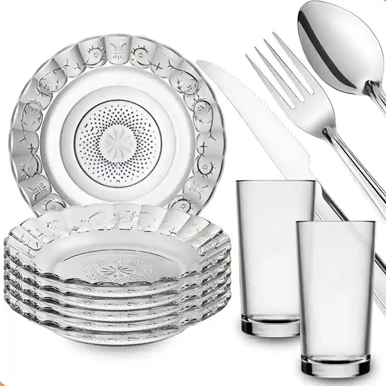 Aparelho De Jantar 30 Peças - Pratos + Copos + Talheres Inox